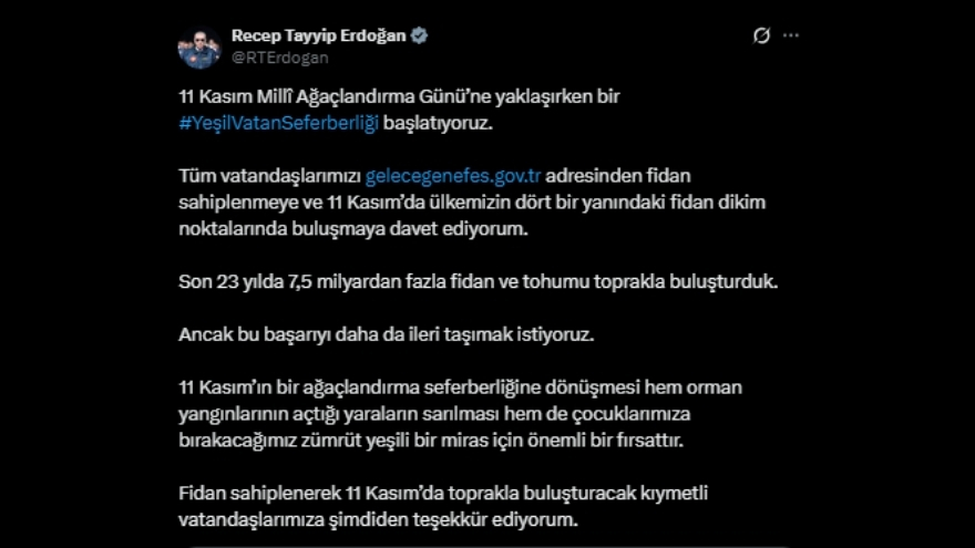 Cumhurbaşkanı Recep Tayyip Erdoğan, sosyal medya hesabından yaptığı paylaşımda, 11 Kasım Millî Ağaçlandırma Günü öncesinde Yeşil Vatan Seferberliğini başlattıklarını duyurdu.