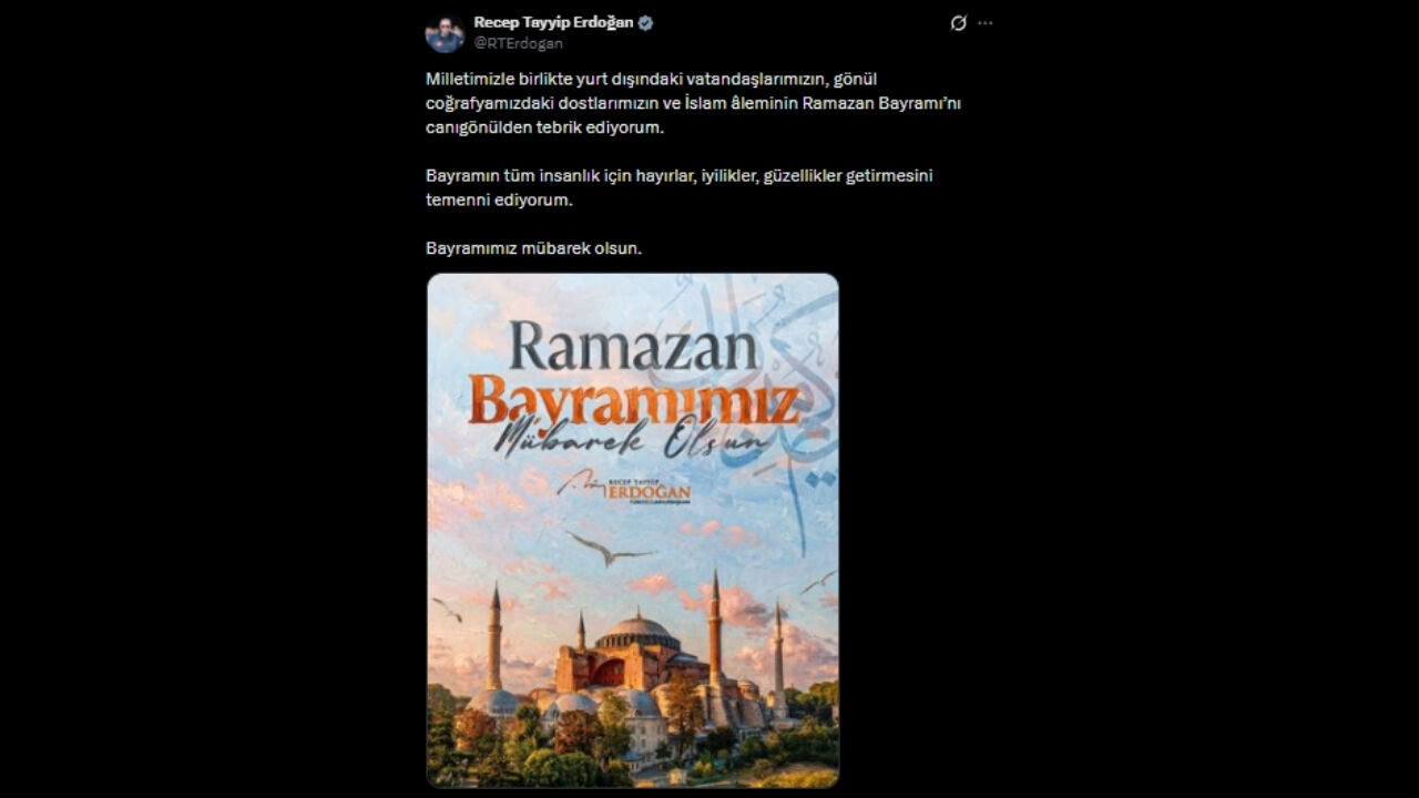 Cumhurbaşkanı Recep Tayyip Erdoğan, Ramazan Bayramı dolayısıyla sosyal medya hesabından bir mesaj yayımladı. Mesajında hem yurt içindeki vatandaşlara hem de yurt dışındaki Türk vatandaşlarına seslenen Erdoğan, bayramın tüm insanlık için hayırlara vesile olmasını temenni etti. Paylaşım, birlik ve dayanışma vurgusuyla dikkat çekti.