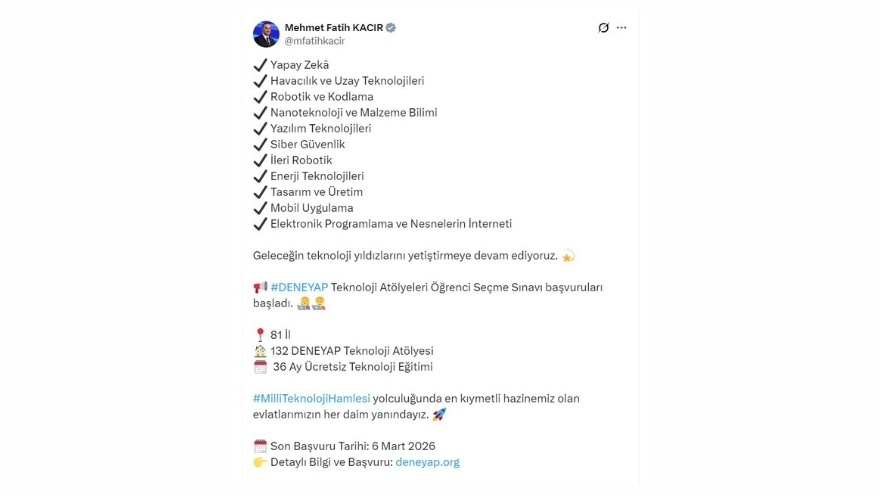 Açıklamasında gençlere verilen öneme de dikkat çeken Kacır, "DENEYAP Teknoloji Atölyeleri öğrenci seçme sınavı başvuruları başladı. Milli Teknoloji Hamlesi yolculuğunda en kıymetli hazinemiz olan evlatlarımızın her daim yanındayız" sözleriyle sürece dair mesaj verdi.