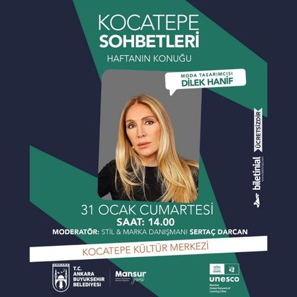 ‘’Moda Tasarımcısı Dilek Hanif, Kocatepe Sohbetleri kapsamında Ankaralılarla buluşuyor. Dilek Hanif; moda tasarım dünyasından önemli detaylar ile üretim ve başarı yolculuğunu kendi anlatımıyla dinleyicilerle paylaşacak.’’