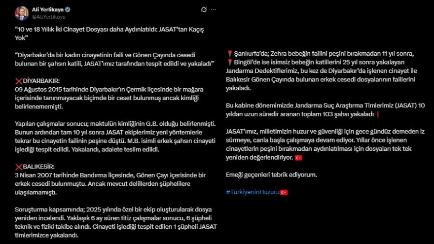 Yerlikaya, "Şanlıurfa’da; Zehra bebeğin failini peşini bırakmadan 11 yıl sonra, Bingöl’de ise isimsiz bebeğin katillerini 25 yıl sonra yakalayan Jandarma Dedektiflerimiz, bu kez de Diyarbakır’da işlenen cinayet ile Balıkesir Gönen Çayında bulunan erkek cesedi dosyalarının faillerini yakaladı" ifadelerini kullandı.