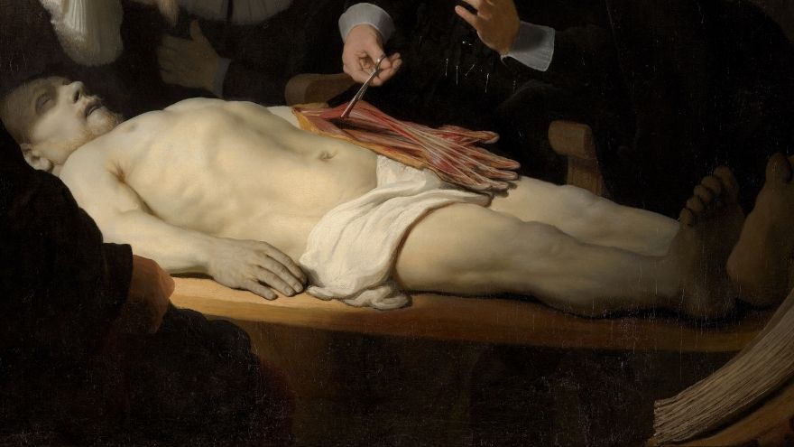 Eser, Dr. Nicolaes Tulp ve asistanlarının ceset üzerinde anatomi eğitimi verdiği anı canlı detaylarla betimliyor. Ölüm gölgesi ve açık kitap gibi sembollerle bilim ve yaşam iç içe sunuluyor.