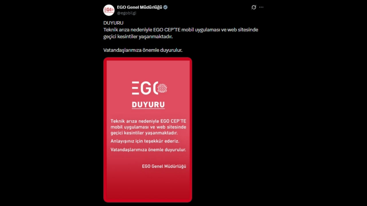 “Teknik arıza nedeniyle EGO CEP'TE mobil uygulaması ve web sitesinde geçici kesintiler yaşanmaktadır. Anlayışınız için teşekkür ederiz. Vatandaşlarımıza önemle duyurulur.”