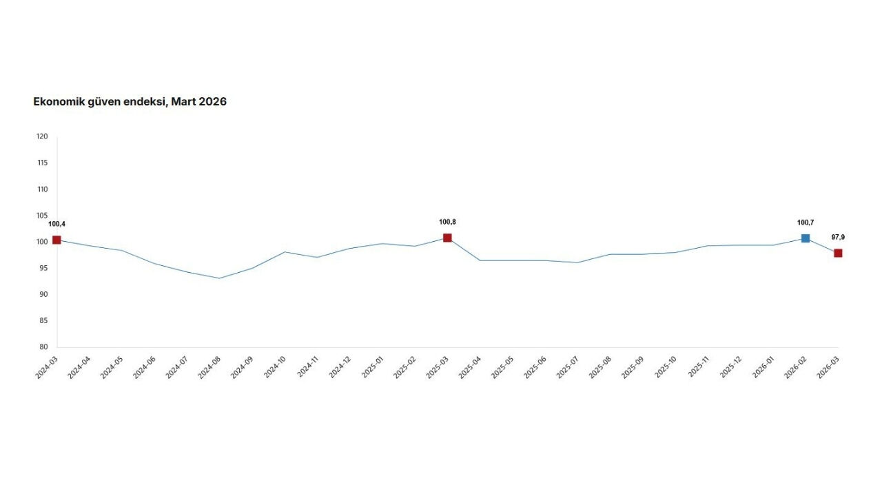 Türkiye İstatistik Kurumu (TÜİK) tarafından paylaşılan Mart 2026 verilerine göre ekonomik güven endeksi bir önceki aya göre yüzde 2,8 oranında gerileyerek 97,9 seviyesine düştü. Bu düşüş, genel ekonomik beklentilerde bir zayıflamaya işaret etti.
