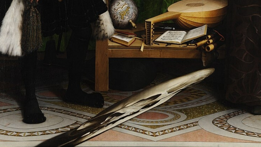 Tablonun en çarpıcı detaylarından biri, ancak doğru açıdan bakıldığında ortaya çıkan kafatası. Bu ustalıkla yerleştirilmiş perspektif detayı, Holbein’in gerçekçilik ve teknik mükemmelliğe verdiği önemi gösteriyor.