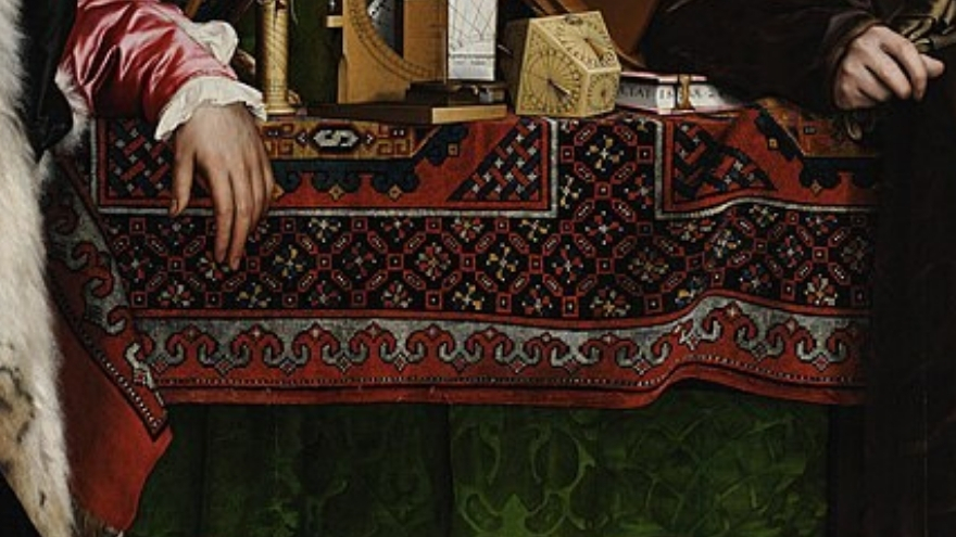 Masanın üzerindeki erken dönem Türk halısı, görsel bir şölen sunarken kültürel ve tarihsel gerçekçiliği artırıyor. Halının dokusu ve detayları, Holbein’in sadece portre değil, aynı zamanda dönemin zenginliklerini ve ticari ilişkilerini de gözler önüne sermek istediğini kanıtlıyor.