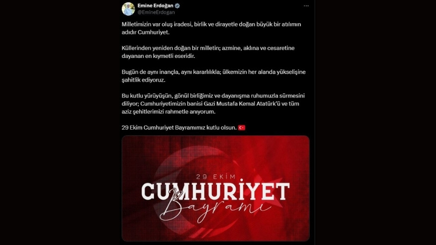 Emine Erdoğan, Türkiye’nin gücünü birlikten aldığını vurgulayarak, “Bu kutlu yürüyüşün, gönül birliğimiz ve dayanışma ruhumuzla sürmesini diliyor; Cumhuriyetimizin banisi Gazi Mustafa Kemal Atatürk’ü ve tüm aziz şehitlerimizi rahmetle anıyorum. 29 Ekim Cumhuriyet Bayramımız kutlu olsun” dedi.