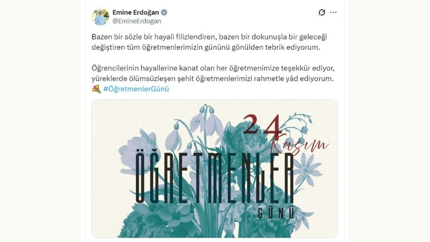 Paylaşımında şehit olan öğretmenleri de unutmayan Emine Erdoğan, “Öğrencilerinin hayallerine kanat olan her öğretmenimize teşekkür ediyor, yüreklerde ölümsüzleşen şehit öğretmenlerimizi rahmetle yad ediyorum” sözleriyle hayatını görev başında kaybeden eğitim neferlerine saygı ve minnet dileklerini iletti.
