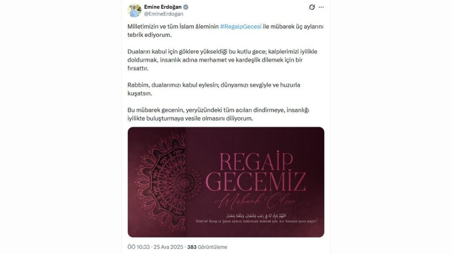 Emine Erdoğan, sosyal medya üzerinden yayımladığı mesajında, “Milletimizin ve tüm İslam aleminin Regaip Gecesi ile mübarek üç aylarını tebrik ediyorum” diyerek manevi duyguları paylaştı.