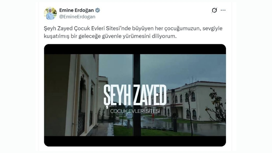 Emine Erdoğan, sosyal medya hesabından yaptığı paylaşımda, "Şeyh Zayed Çocuk Evleri Sitesi’nde büyüyen her çocuğumuzun, sevgiyle kuşatılmış bir geleceğe güvenle yürümesini diliyorum" dedi.