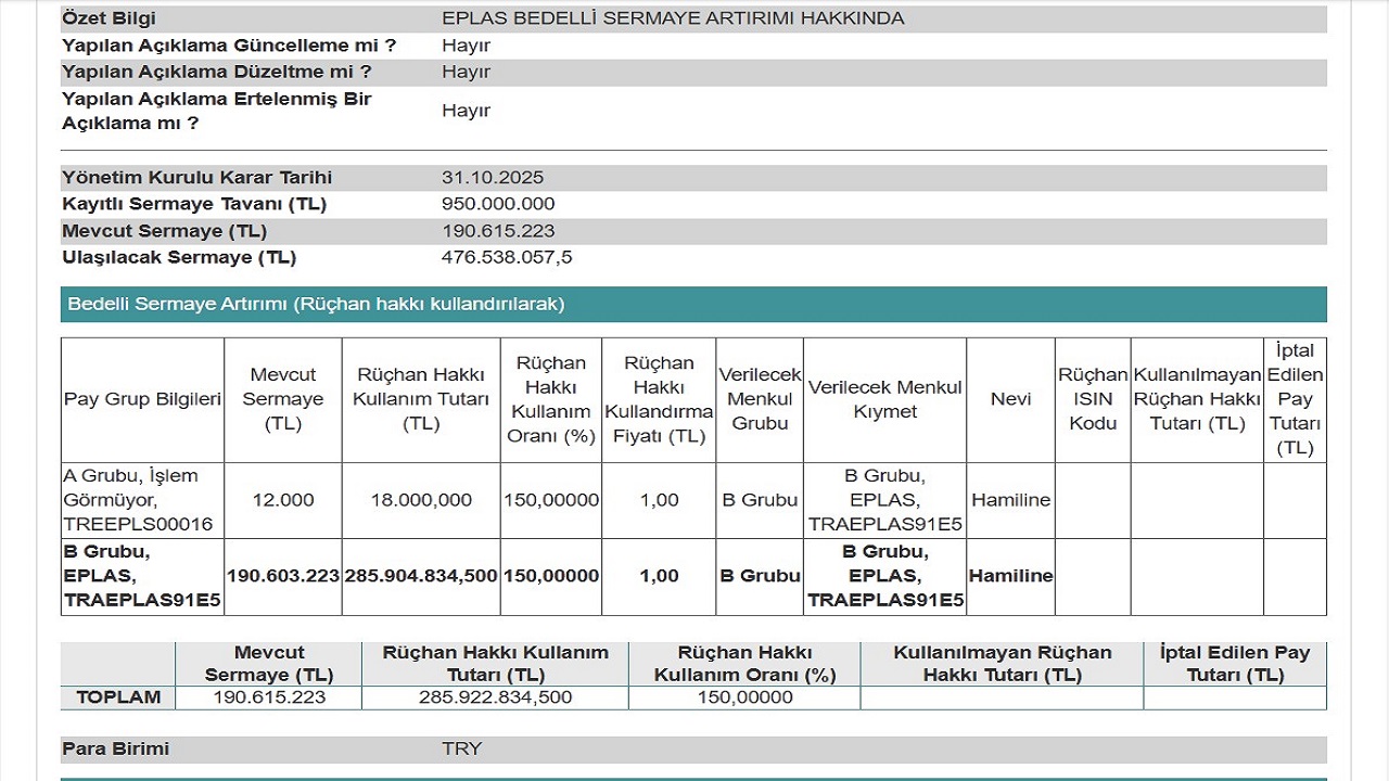 Elinde 10 lot EPLAS hisse bulunan yatırımcıya 15 lot rüçhan hakkı tanımlanacak. Bedelli sermaye artırımına onay geldiğinde, söz konusu yatırımcı 15 TL ödeme karşılığında yeni hisselerine kavuşabilecek. İlgili tarihte, yatırımcının hesabında rüçhan hakkına karşılık gelecek rakamı bulundurması ve bedelli sermaye artırımına katılmak istediğine dair kullandığı aracı kuruma bilgi vermesi yeterli olacaktır.