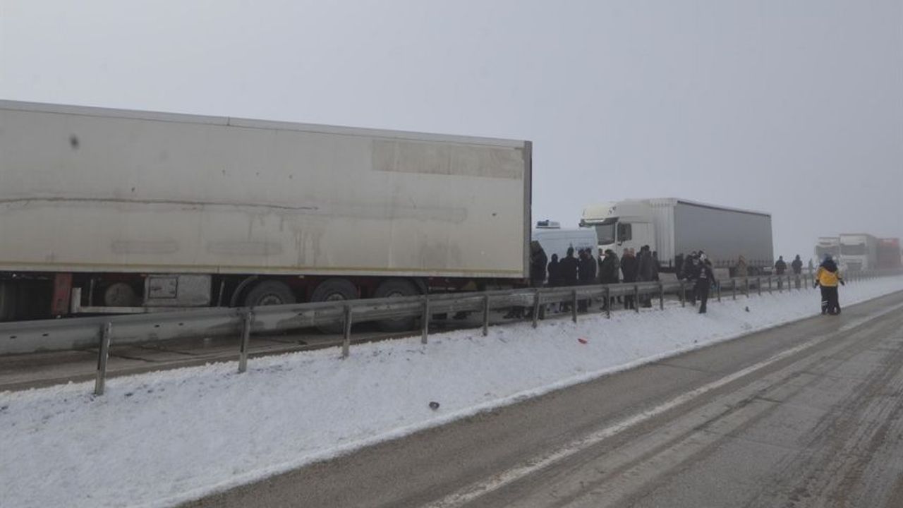 Kazada yoğun sis ve kar yağışı sebebiyle kayganlaşan yolda Erzurum istikametine giden Şırnak plakalı tır yolda kaydı.