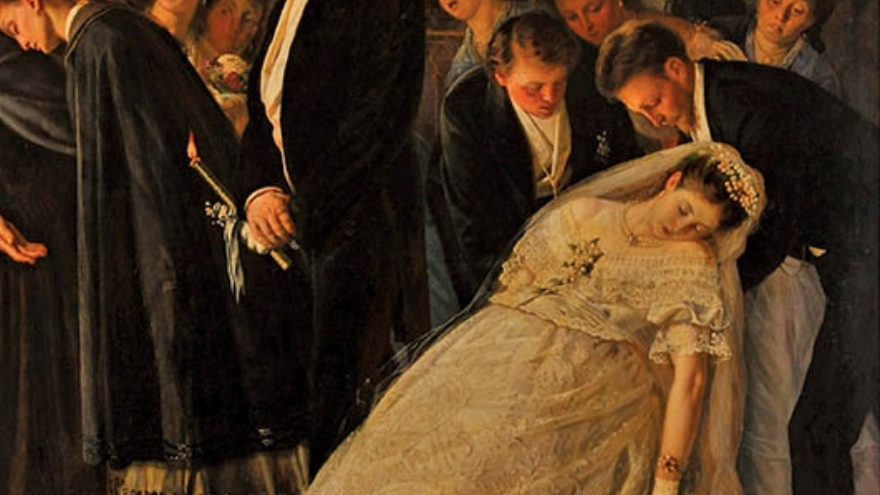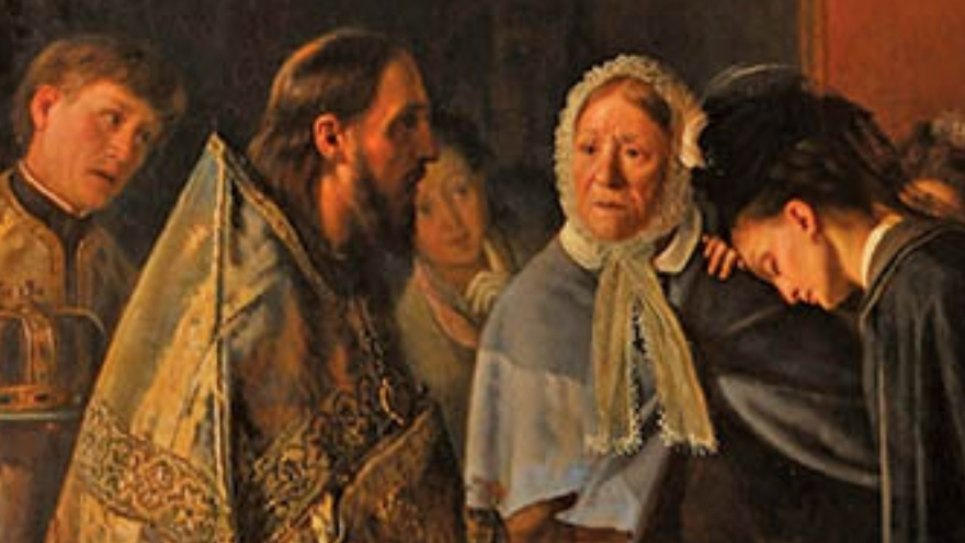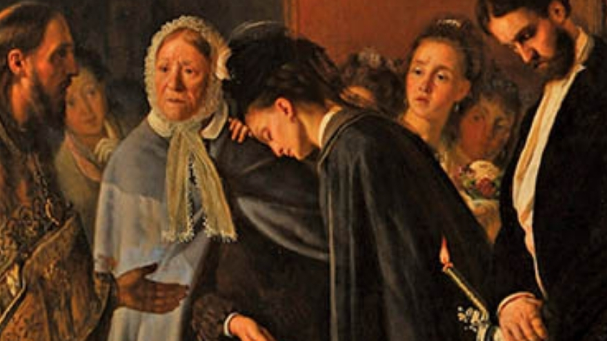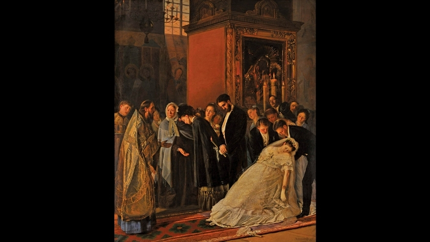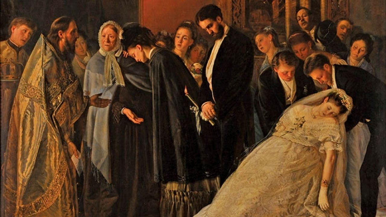 Pukirev’in tablosu, düğün töreniyle açılan ama bir yüzleşmeyle kapanan bir hikayeyi anlatır. Damat, tam da yemin etmek üzereyken geçmişinden gelen bir hayaletle, yani ilk eşiyle karşılaşır. O an, kutsal bir ritüel paramparça olur.