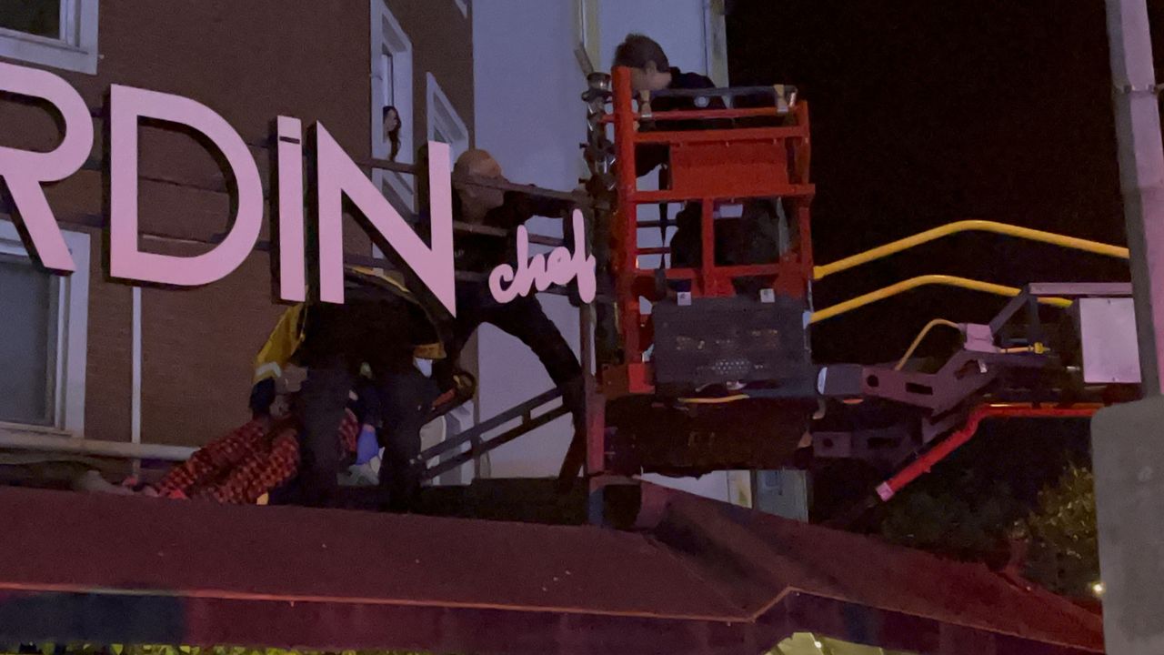 Genç adam, düşüşün etkisiyle binanın altındaki kafenin tentesi üzerinde mahsur kaldı.