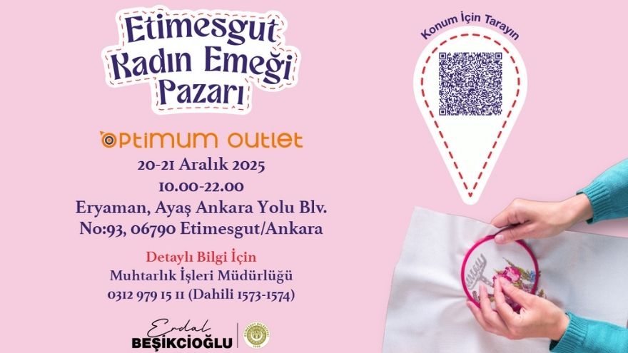 Etimesgut Belediyesi Muhtarlık İşleri Müdürlüğü’nün koordinasyonu ile gerçekleşecek olan Etimesgut Kadın Emeği Pazarı etkinliği, 20-21 Aralık tarihleri arasında Eryaman Optimum Outlet AVM’de düzenlenecek.