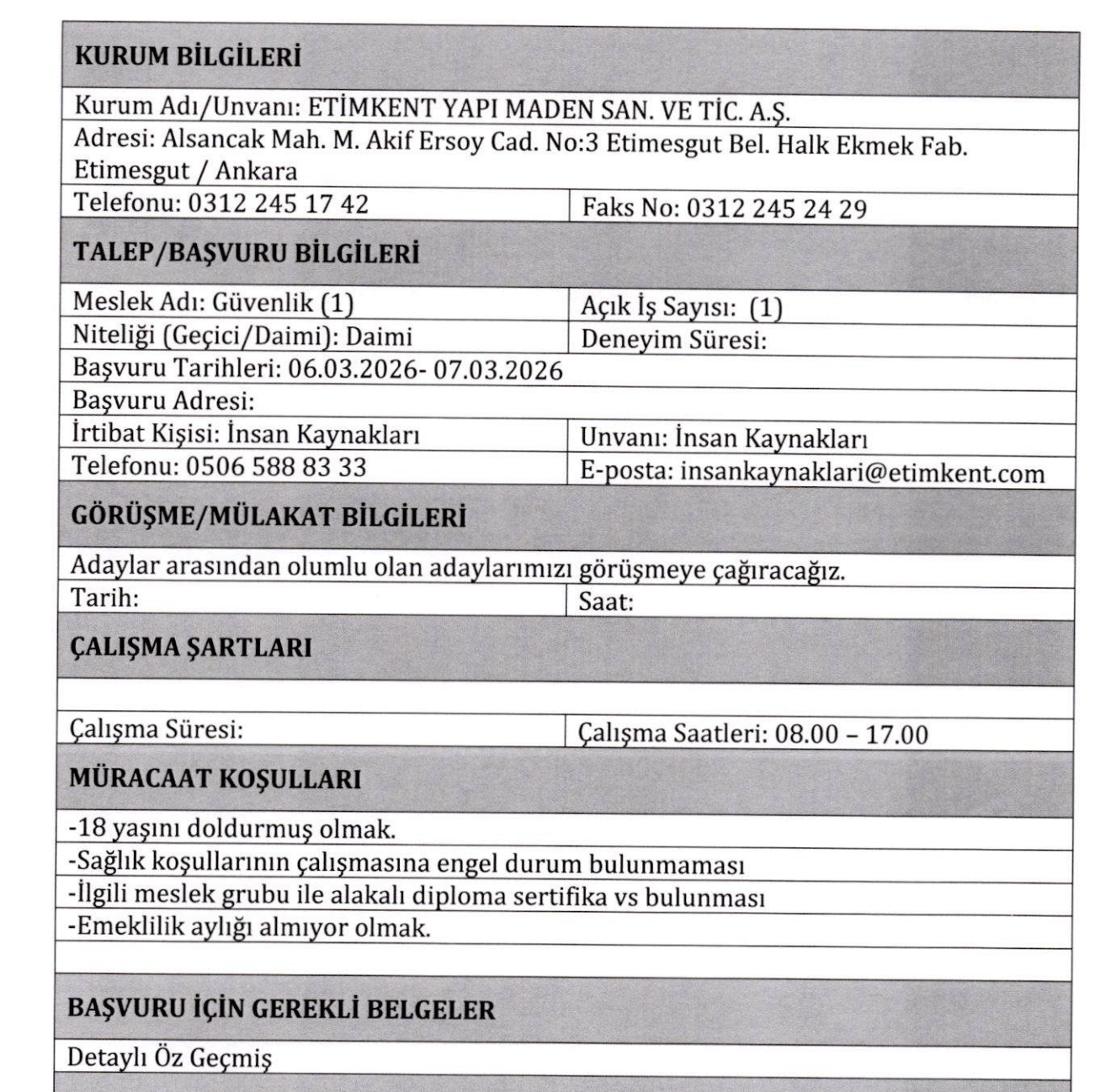 Etimesgut ilçesinde faaliyet gösteren Etimkent, bünyesine daimi bir güvenlik görevlisi alacağını duyurdu. Personel alımı İŞKUR üzerinden yayımlanan ilanla açıklandı. Son başvuru günü 7 Mart olarak belirlendi.