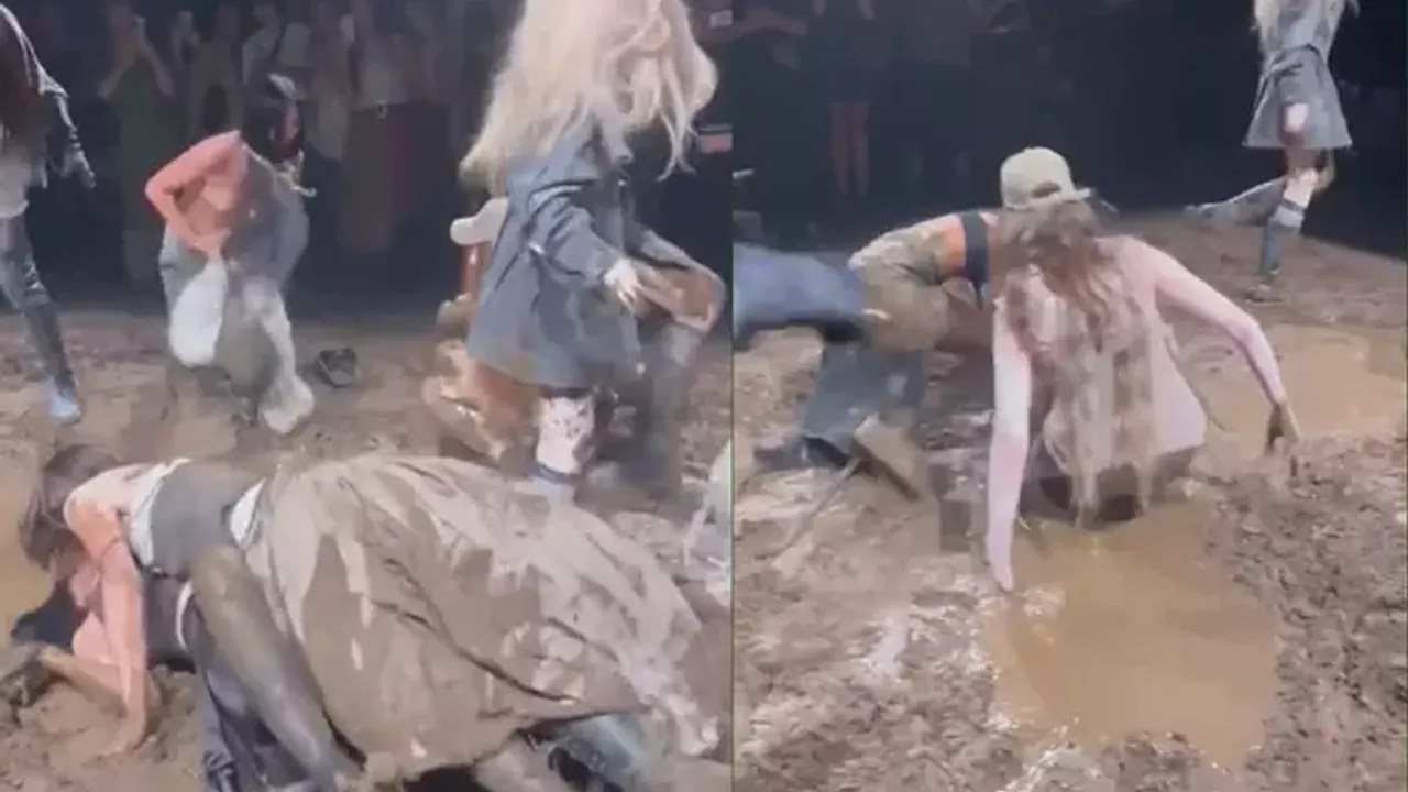 Sosyal medyada gündem olan defilede modeller, çamurla kaplı podyumda güreşti.