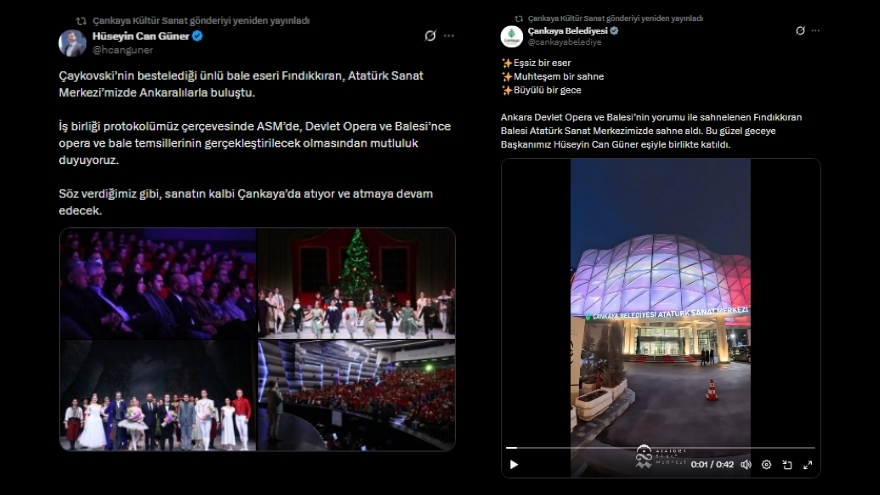 “Çaykovski’nin bestelediği ünlü bale eseri Fındıkkıran, Atatürk Sanat Merkezi’mizde Ankaralılarla buluştu. İş birliği protokolümüz çerçevesinde ASM’de, Devlet Opera ve Balesi’nce opera ve bale temsillerinin gerçekleştirilecek olmasından mutluluk duyuyoruz. Söz verdiğimiz gibi, sanatın kalbi Çankaya’da atıyor ve atmaya devam edecek.”