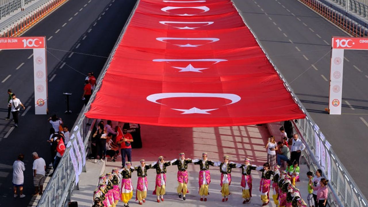 Adana 15 Temmuz Şehitler Köprüsü'nde 1699 metre uzunluğunda ve 9 metre genişliğindeki dev Türk bayrağının ve Atatürk posterinin altında Cumhuriyet'in 100. yılı kutlamaları yapılarak bayramın coşkusu yaşandı.
