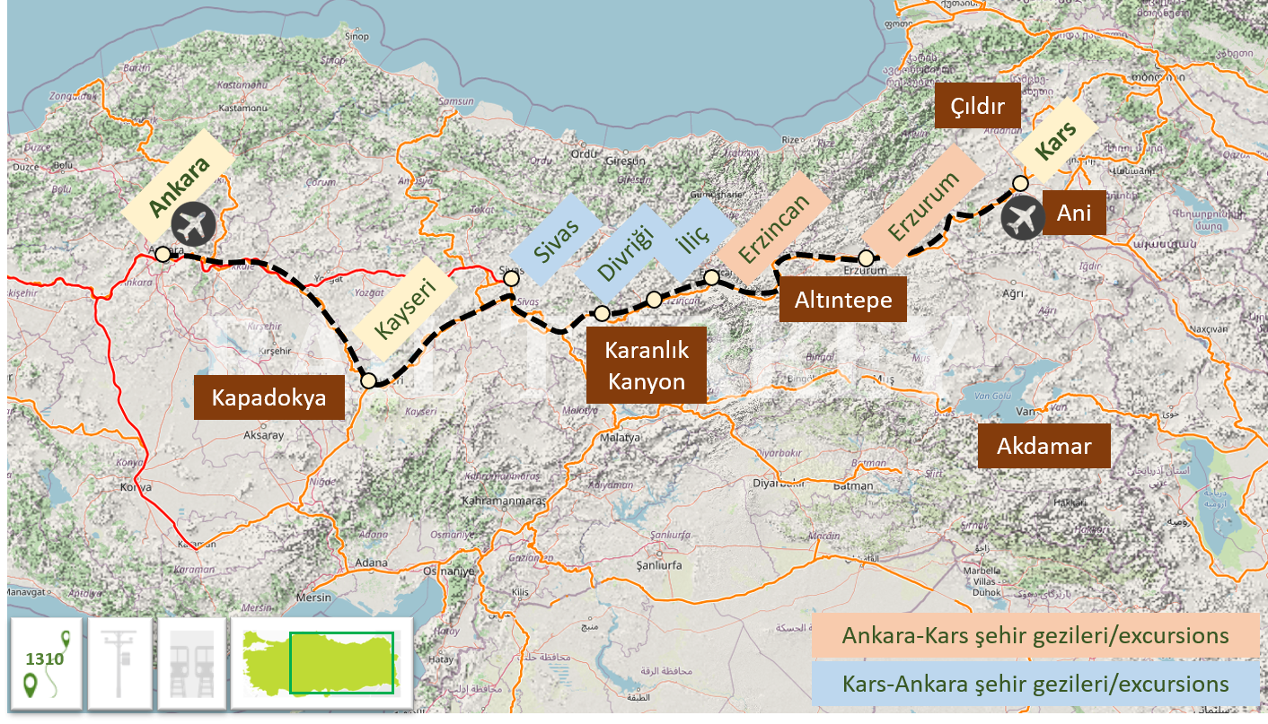 Gidiş yönündeki 4 saatlik mola sayesinde Erzurum'un simgesi Çifte Minareli Medrese ve Rüstem Paşa Kervansarayı (Taşhan) ziyaret edilebiliyor.