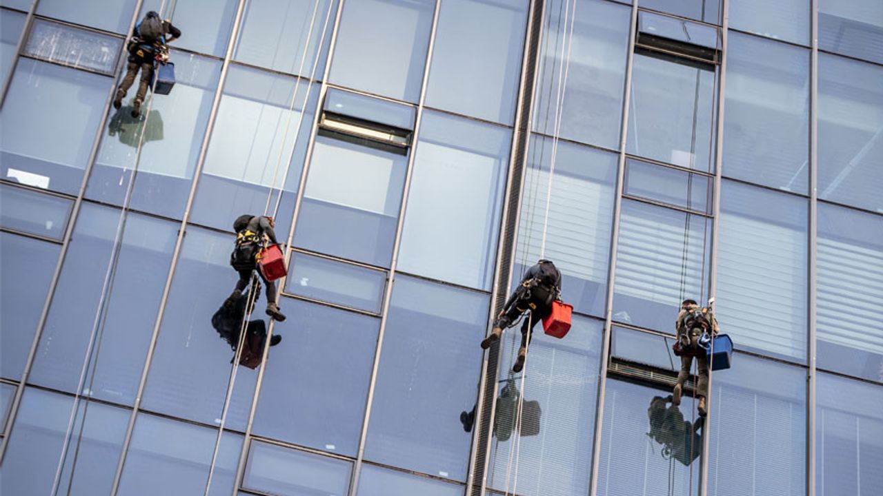 İş merkezinin dış cephe bakım ve temizliğini üstlenen teknisyenler adrenalini doruklarına kadar hissederlerken dünyanın da en zor işlerinden birini yapıyorlar.