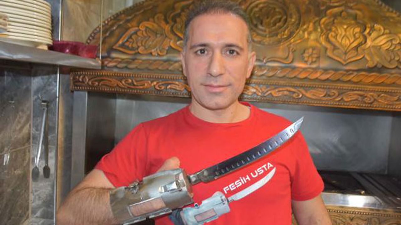 İzmir’de 2015 yılında çalıştığı iş yerinde elini kıyma makinesine kaptıran ve engelli olarak yaşamını sürdüren Fesih Gündem (45), kendi geliştirdiği krom malzemeden yapılan ‘aparat el’ sayesinde hayata tutundu. Bir restoranda kebap ustası olan Fesih Gündem, aparata bıçakları takıp çıkararak; elini döner kesme, et açma, salata doğrama amaçlı kullanabiliyor.
