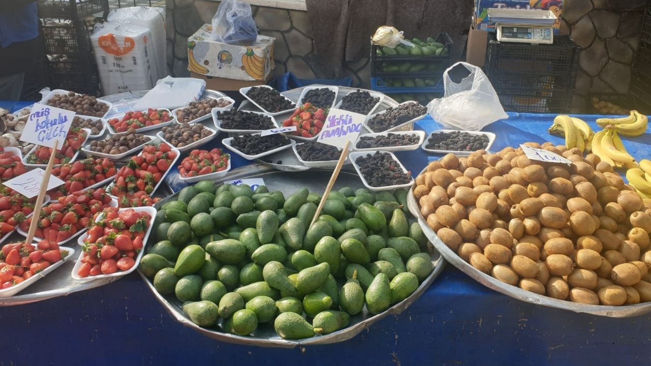 Tezgahlarda sadece yerli ürünler değil, avokado, çilek, karadut ve kivi gibi ürünler de yer alıyor. Özellikle çilek gibi erkenci meyveler 250 TL’den satışa sunuluyor.