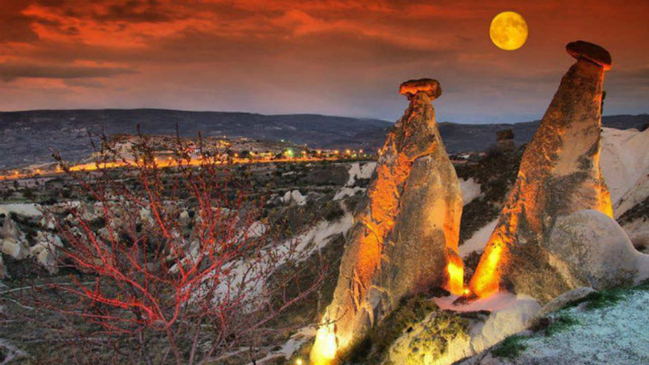 Üç Güzeller’de, rüzgar ve sel suları kayaların zeminini aşındırırken üst kısımlarına dokunmamış ve sert kayalar gövdeleri huni şeklinde, başları ise düştü düşecek şapkalı peribacalarına dönüşmüştür.