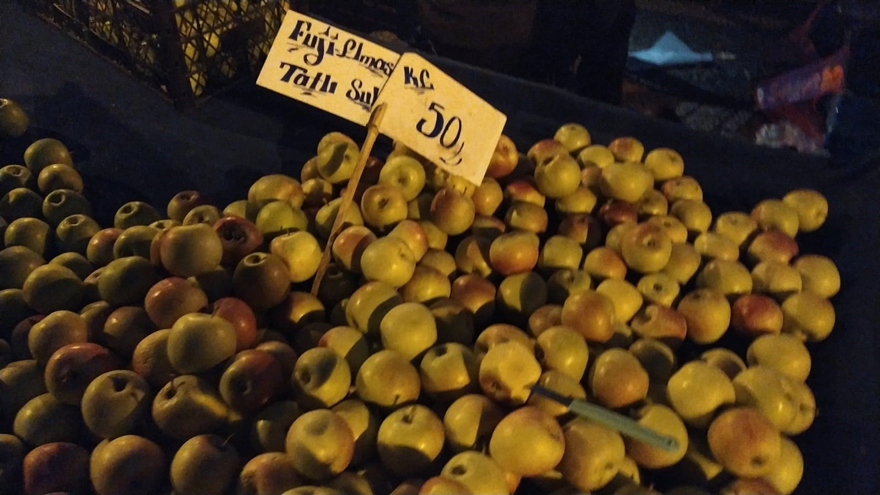 Kış aylarının vazgeçilmez meyvesi elma da akşam saatlerinde tezgahlarda 50 liradan satışa sunuldu.