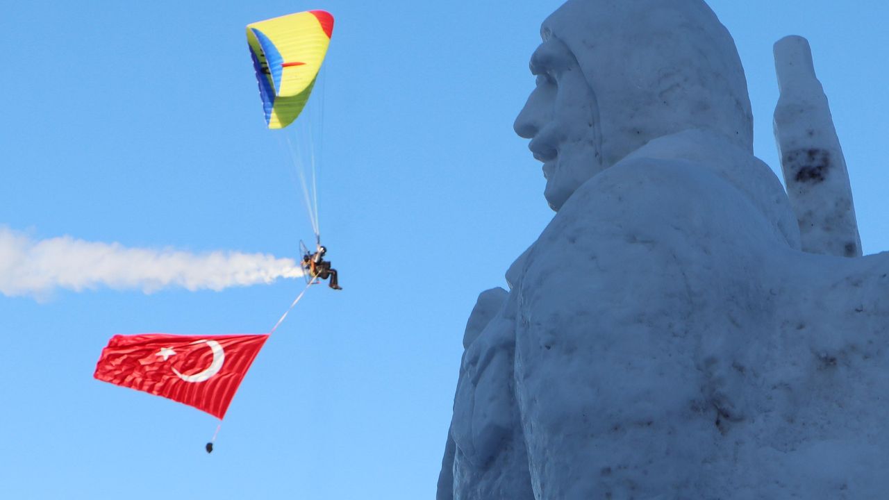 Protokol, geçen yıl kuraklık nedeniyle yapılamayan bu yıl ise 200 kamyon kar taşınarak, 9 heykeltıraş tarafından 7 günde yapılan heykelin açılışını gerçekleştirdi. Heykelin üzerindeki Türk bayrağı kaldırılarak karanfil bırakıldı.