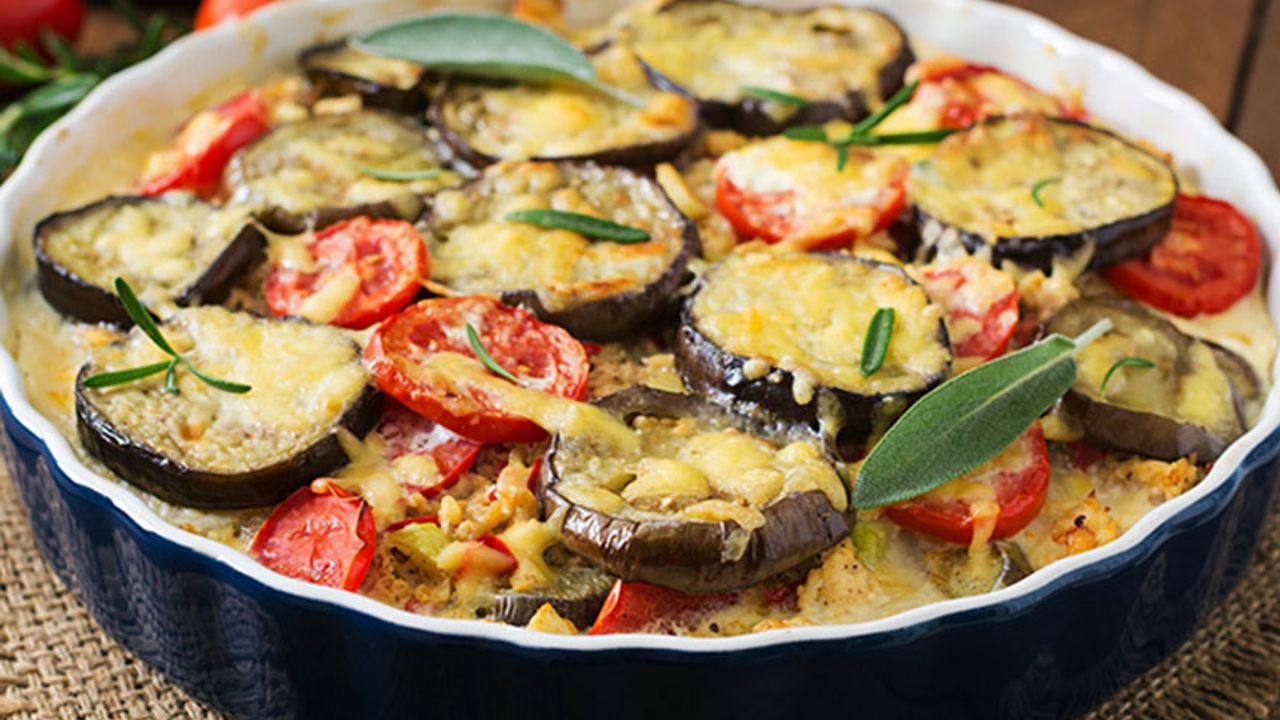 Bir fırın kabına yaptığınız soğanlı karışımı yayın. Üzerine patlıcan dilimlerini tek sıra halinde dizin.