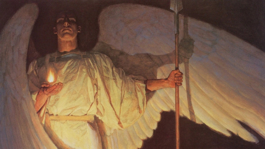 Eserde en çok göz alan detaylardan biri, meleğin sağ elinin üzerinde yükselen parlak alev. Alevin ele doğrudan temas etmemesi, Blackshear’ın bilinçli bir tercihi. Bu küçük ayrıntı, gücün kaynağının melek değil, onun aracılık ettiği ilahi otorite olduğunu sessizce anlatıyor. Sol elindeki mızrak ise korumanın pasif değil, aktif biçimde sürdüğünü vurguluyor.