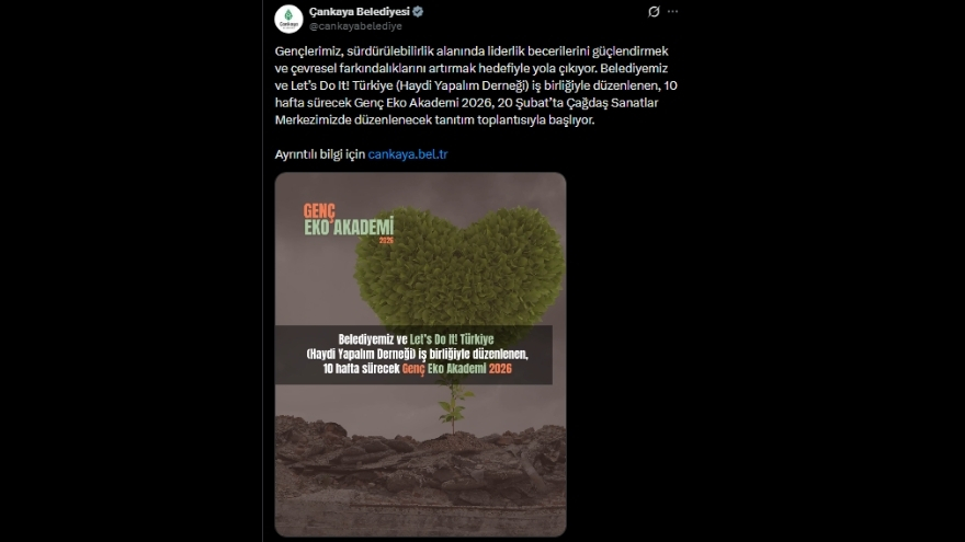 Çankaya Belediyesi sosyal medya hesabı üzerinden yaptığı duyuruda, “Gençlerimiz, sürdürülebilirlik alanında liderlik becerilerini güçlendirmek ve çevresel farkındalıklarını artırmak hedefiyle yola çıkıyor. Belediyemiz ve Let’s Do It! Türkiye (Haydi Yapalım Derneği) iş birliğiyle düzenlenen, 10 hafta sürecek Genç Eko Akademi 2026, 20 Şubat’ta Çağdaş Sanatlar Merkezimizde düzenlenecek tanıtım toplantısıyla başlıyor” ifadelerine yer verdi.