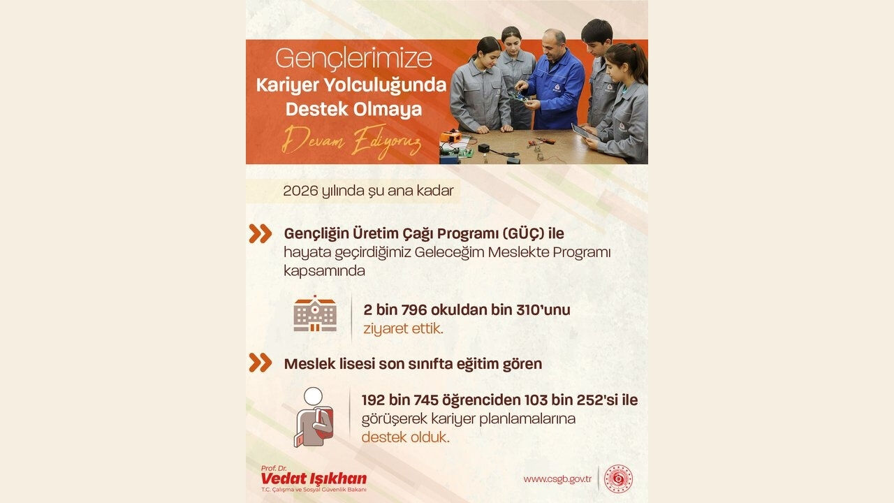 Bakan Işıkhan, sosyal medya hesabından yaptığı paylaşımda hedeflerini de aktardı. Açıklamada, "Genç İstihdam Hamlesi-GÜÇ Projemiz kapsamında Geleceğim Meslekte Uygulaması’nı hayata geçirmiştik. Hedefimiz; her sene yaklaşık 250 bin meslek lisesi ve meslek yüksekokulu son sınıf öğrencimize ulaşmak, onları iş ve meslek danışmanlarıyla buluşturmak. 3 yılda toplam 750 bin gencimizi iş hayatının dinamiklerine hazırlamak. Bu yıl toplam; 2 bin 796 okuldan 1310’unu ziyaret ettik. Meslek lisesi son sınıfta eğitim gören 192 bin 745 öğrenciden 103 bin 252’sine kariyer planlamalarında destek olduk. Kendine inanan, geleceğine emin adımlarla yürüyen gençlerimizin en büyük destekçisi olmaya devam edeceğiz" ifadelerini kullandı.