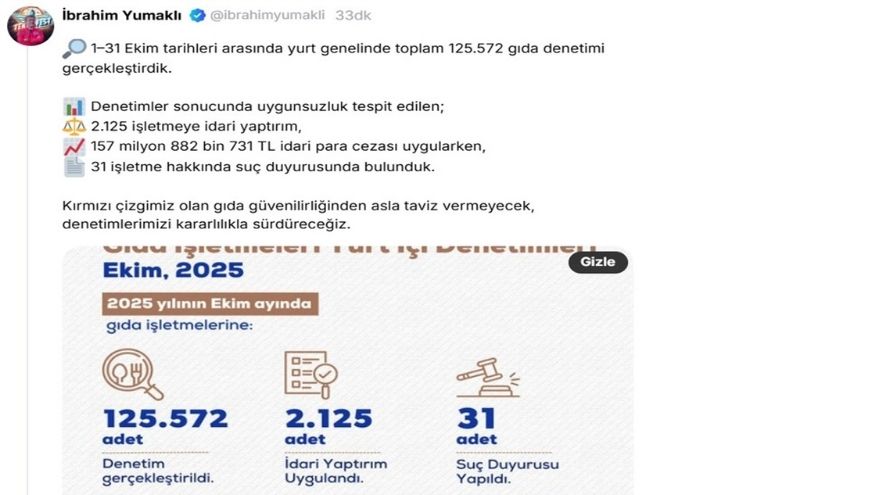 Yumaklı, NSosyal medya hesabından gıda denetimlerine ilişkin yaptığı paylaşımda, "1-31 Ekim tarihleri arasında yurt genelinde toplam 125 bin 572 gıda denetimi gerçekleştirdik. Denetimler sonucunda uygunsuzluk tespit edilen; 2 bin 125 işletmeye idari yaptırım, 157 milyon 882 bin 731 TL idari para cezası uygularken, 31 işletme hakkında suç duyurusunda bulunduk. Kırmızı çizgimiz olan gıda güvenilirliğinden asla taviz vermeyecek, denetimlerimizi kararlılıkla sürdüreceğiz" ifadelerini kullandı.