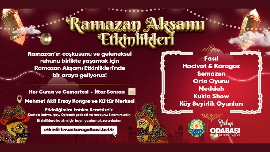 Gölbaşı Belediyesi tarafından Ramazan ayı boyunca her cuma ve cumartesi günü saat 21.15’te, Mehmet Akif Ersoy Kongre ve Kültür Merkezi’nde düzenlenecek Ramazan Akşamı Etkinlikleri, her yaştan vatandaşa hitap edecek zengin içeriklerle gerçekleştirilecek.