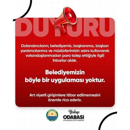 ‘’Dolandırıcıların; belediyemiz, başkanımız, başkan yardımcılarımız ve müdürlerimizin adını kullanarak vatandaşlarımızdan para talep ettiğiyle ilgili ihbarlar aldık. Belediyemizin böyle bir uygulaması yoktur. Art niyetli girişimlere itibar edilmemesini önemle rica ederiz.’’