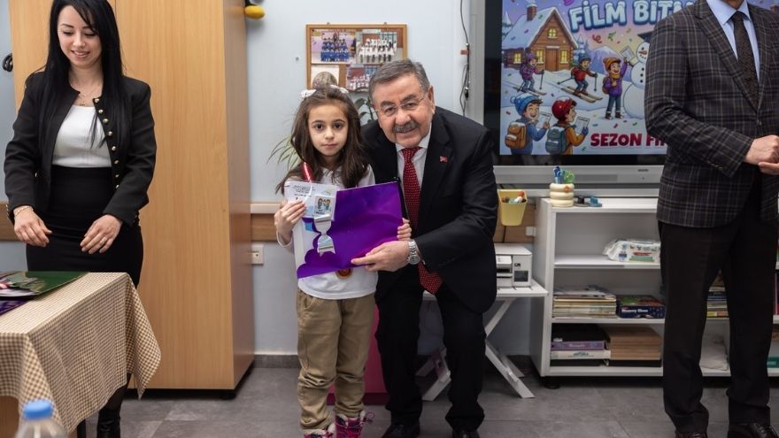 Tören kapsamında okulun sınıflarını tek tek ziyaret eden protokol üyeleri, her bir öğrenciyle yakından ilgilenerek karnelerini bizzat takdim etti.