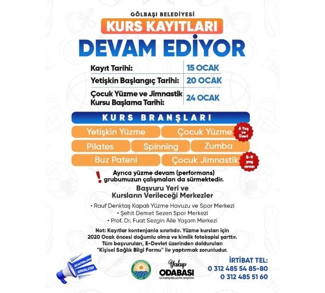 Gölbaşı Belediyesi Yetişkin ve Çocuk Yüzme (6 yaş ve üzeri), Zumba, Pilates, Spinning, Buz Pateni ve Çocuk Jimnastik Kursları (5-9 yaş) için yeni kayıt dönemi başlıyor.