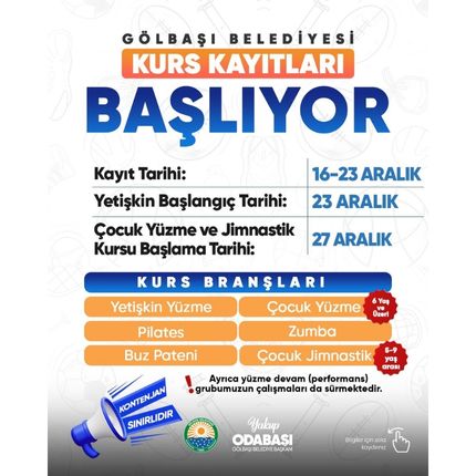 Yetişkin kursları 23 Aralık 2025, çocuk yüzme ve jimnastik kursları ise 27 Aralık 2025 tarihinde başlayacak.