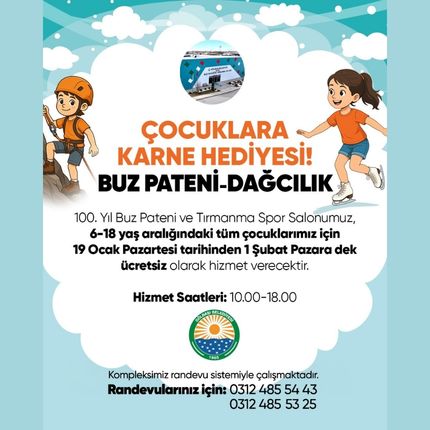 Sporsever gençlerin tatil boyunca uğrak noktası olacak tesislerdeki kullanım şartları netleşti. Bu çerçevede 100. Yıl Buz Pateni ve Tırmanma Spor Salonu, 19 Ocak-1 Şubat 2026 tarihleri arasında 6-18 yaş grubundaki tüm çocuklara ücretsiz olarak hizmet sunacak.