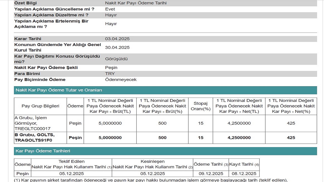Geçtiğimiz Nisan ayında şirketin Yönetim Kurulu tarafından alınan karar, ay çıkmadan yapılan Genel Kurul tarafından da onaylanmıştı. Göltaş'ın temettü dağıtım tarihi ise Kasım ayının sonuna yaklaşılırken açıklandı. Buna göre, GOLTS hisse sahiplerine kar payı ödemeleri 5 Aralık itibariyle gerçekleştirilecek. Borsa İstanbul'da bulunan T+2 kuralı sebebiyle ve araya 2 gün de hafta sonu girmesi nedeniyle; yatırımcıların hesaplarına ödemelerin 9 Aralık 2025 Salı günü geçmesi bekleniyor.