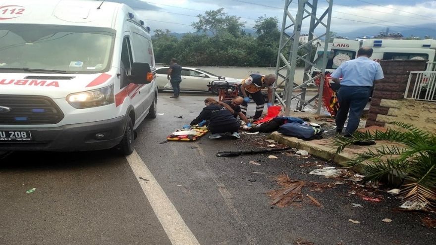 Çarpışmanın etkisiyle motosikletin sürücüsü ve arkasındaki M.A.Ç. yola savrularak ağır yaralandı.