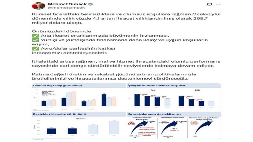 Hazine ve Maliye Bakanı Mehmet Şimşek sosyal medyada yaptığı açıklamalarda, "Küresel ticaretteki belirsizliklere ve olumsuz koşullara rağmen ocak-eylül döneminde yıllık yüzde 4,1 artan ihracat yıllıklandırılmış olarak 269,7 milyar dolara ulaştı. Önümüzdeki dönemde ana ticaret ortaklarımızda büyümenin hızlanması, yurt içi ve yurt dışında finansmana daha kolay ve uygun koşullarla erişim, avro/dolar paritesinin katkısı ihracatımızı destekleyecektir. İthalattaki artışa rağmen, mal ve hizmet ihracatındaki olumlu performans sayesinde cari denge sürdürülebilir seviyelerde kalmaya devam ediyor. Katma değerli üretim ve rekabet gücünü artıran politikalarımızla üreticilerimizi ve ihracatçılarımızı desteklemeyi sürdüreceğiz" ifadelerini kullandı.