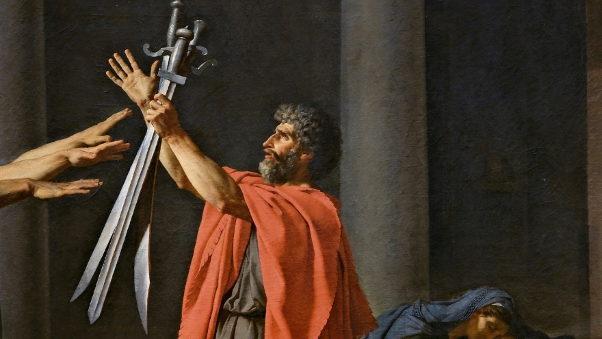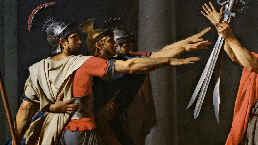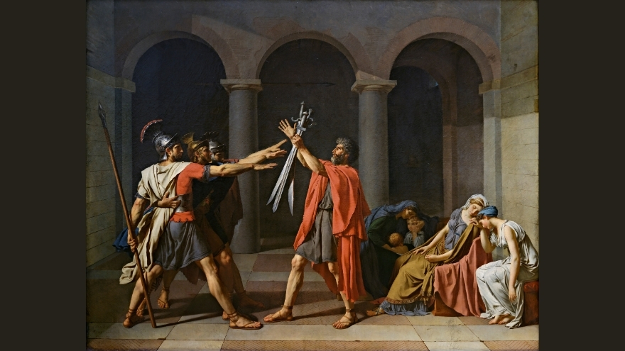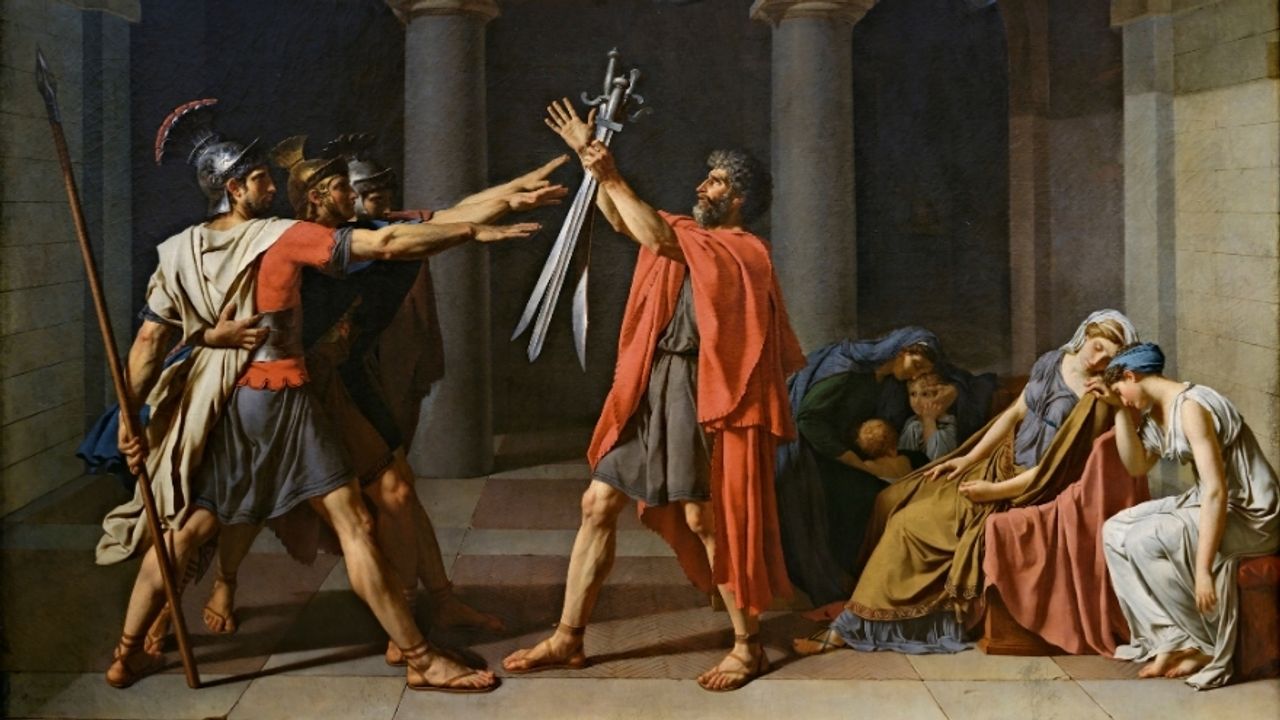 Horas Kardeşlerin Yemini, erkek figürleri görev ve vatan için savaşırken gösteriyor. Horaslar, Roma’nın güvenliği ve onuru için babalarının önünde kılıçlarını kaldırıyor, kişisel duygularını bir kenara bırakıyor.