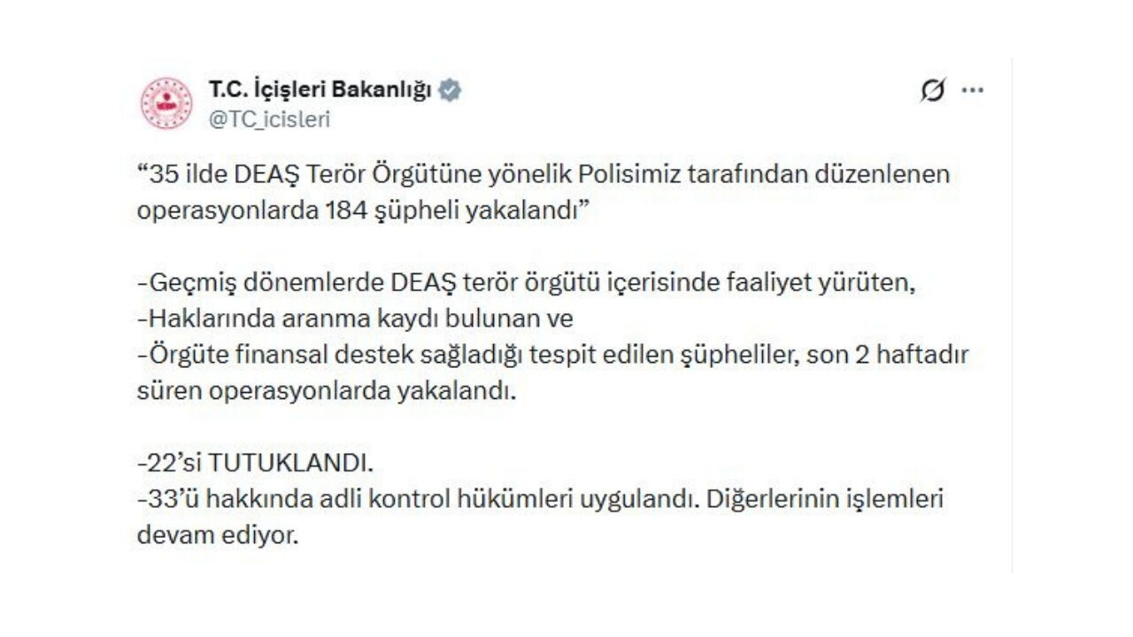 İçişleri Bakanlığı, son iki hafta içinde 35 ilde DEAŞ terör örgütüne yönelik geniş çaplı operasyonlar düzenlendiğini açıkladı. Operasyonlarda 184 şüpheli gözaltına alınırken, 22’si tutuklandı, 33’ü adli kontrolle serbest bırakıldı. Polis ekipleri, şüphelilerin örgüt içi geçmiş faaliyetlerini ve finansal destek bağlantılarını da tespit etti.