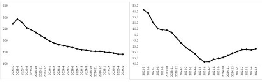Şekil 1: Ortalama otomobil reel fiyatı (2020 Ocak=100) (Sol sütun), ortalama otomobil reel fiyatının yıllık değişimi (%) (Sağ sütun)