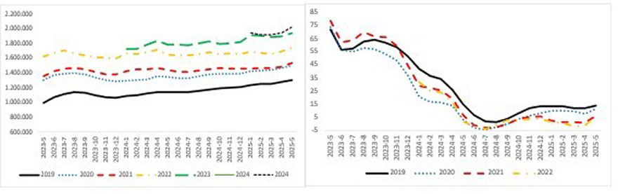 Şekil 3: Yaş gruplarına göre ortalama otomobil fiyatı (TL) (Sol sütun), yaş gruplarına göre ortalama otomobil fiyatının yıllık değişimi (%) (Sağ sütun)