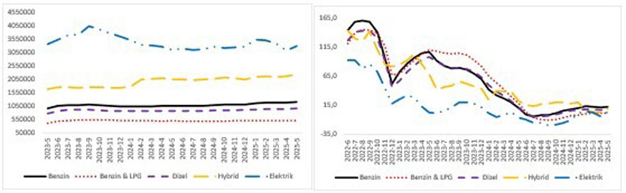 Şekil 4: Yakıt türüne göre ortalama otomobil fiyatı (TL) (Sol sütun), yakıt türüne göre ortalama otomobil fiyatının yıllık değişimi (%) (Sağ sütun)