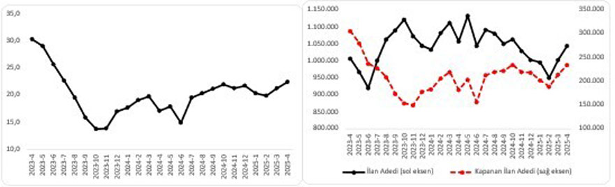 Şekil 5: Satılan otomobil sayısının satılık otomobil ilan sayısına oranı (%) (Sol sütun), satılan ve satılık otomobil sayısı (Sağ sütun)
